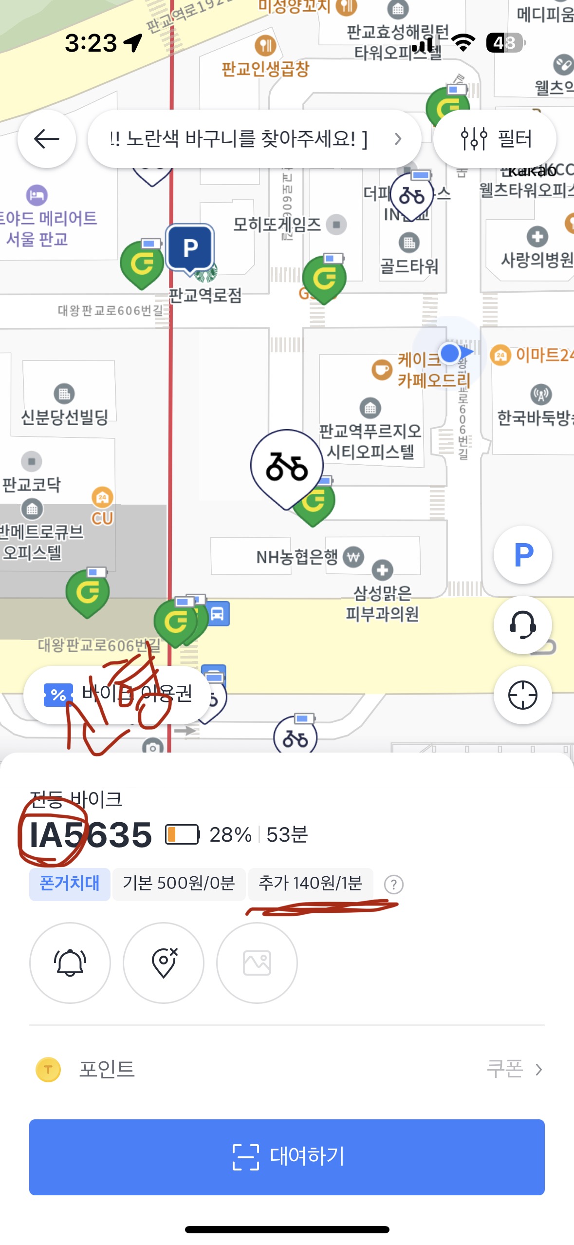 또 "카카오 바이크" 지도를 보시면 "P"가 크게 적혀 있는게 있는데, 이는 자전거 주차장이라고 생각하시면 편할 것 같습니다 ! 그렇기 떄문에 해당 구역에 가면 대여하는 것도 쉽다고 생각하시면 될 것 같습니다.